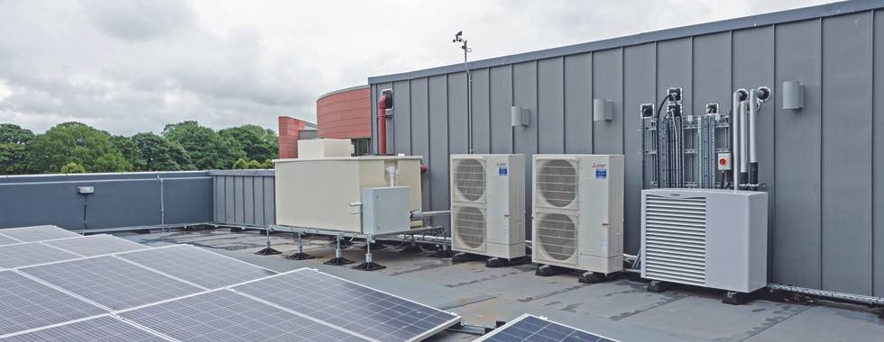 The Green Energy Centre has an integrated plant room on the first floor with a viewing gallery, which acts as a classroom for students to understand the practical aspects of the different management systems for heat source pumps, wind and solar energy and battery storage.